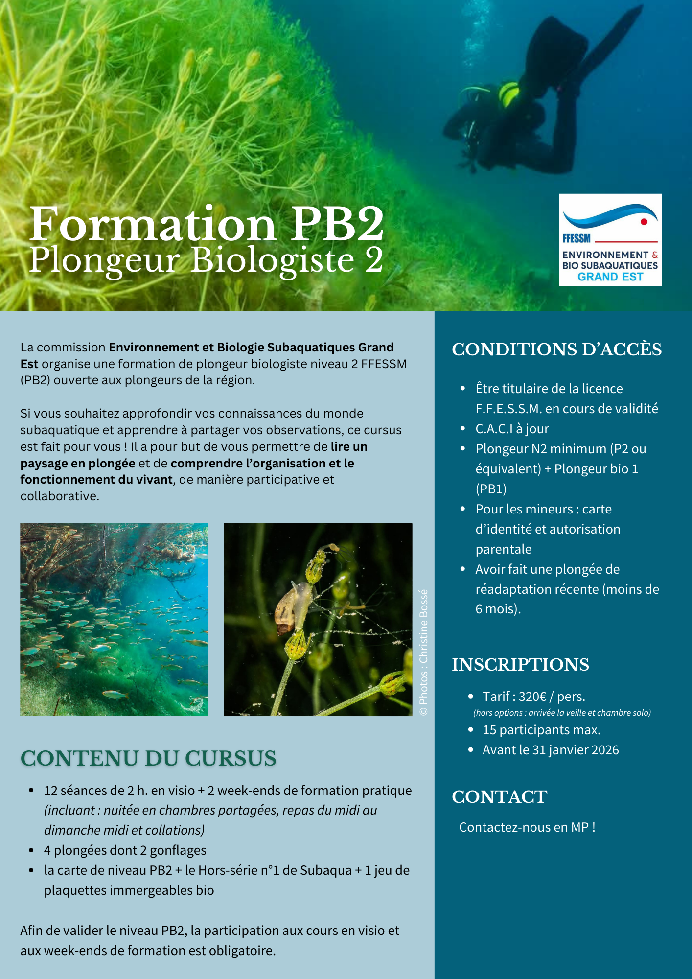 La Commission Environnement et Biologie Subaquatiques Grand Est organise une formation de plongeur biologiste niveau 2 FFESSM (PB2) ouverte aux plongeurs de la région. Si vous souhaitez approfondir vos connaissances du monde subaquatique et apprendre à partager vos observations, ce cursus est fait pour vous ! Il a pour but de vous permettre de lire un paysage en plongée et de comprendre l’organisation et le fonctionnement du vivant, de manière participative et collaborative.